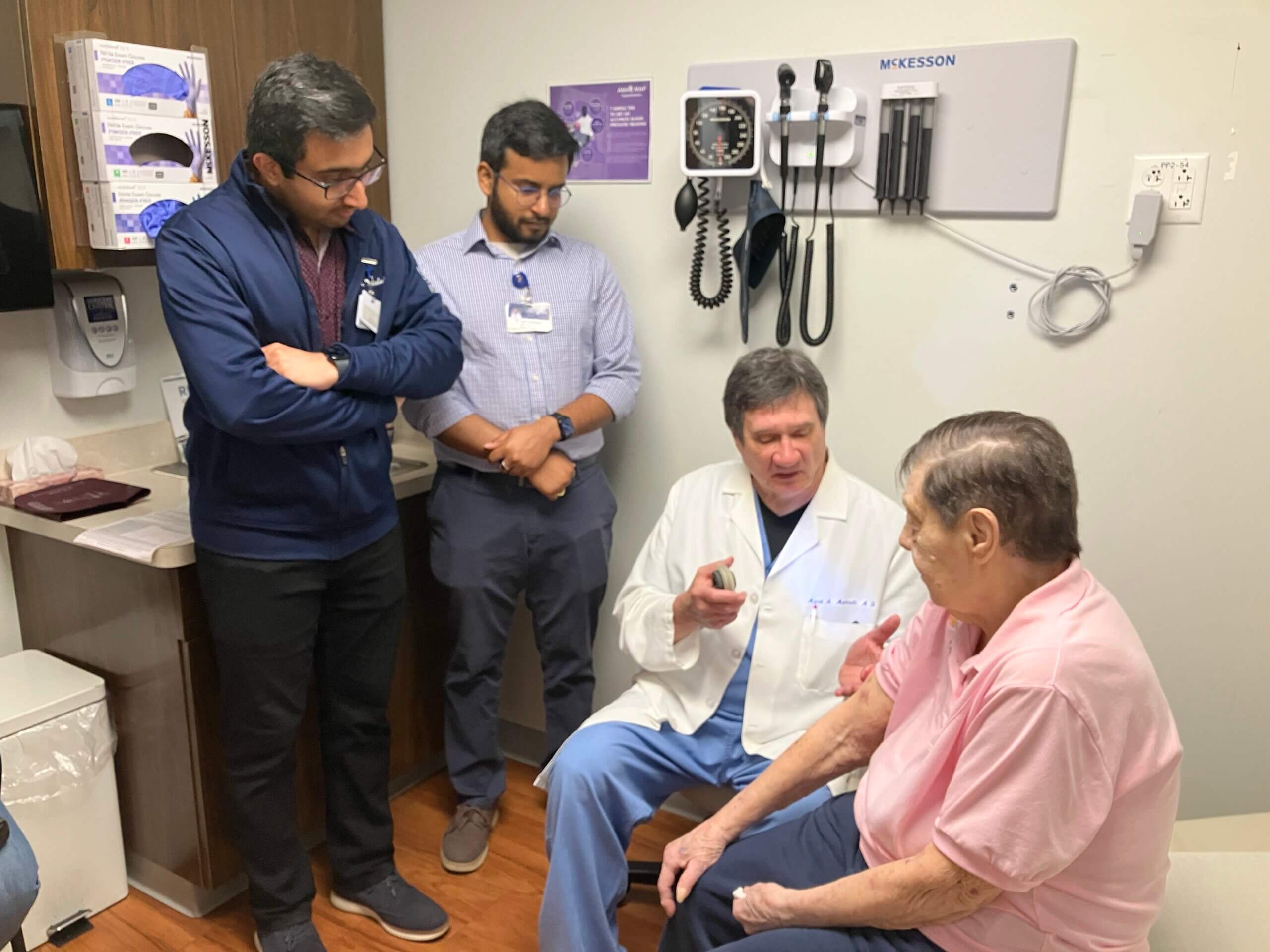 Dr. Mark Marsili. retired from Lackawanna Valley Dermatology Associates, examines Joan Welby as residents observe.